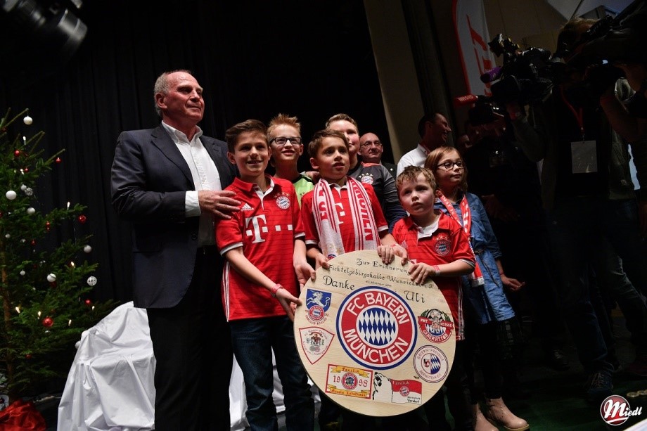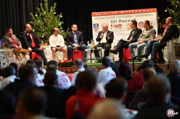 Als Uli Hoeneß gegen Mittag in der Fichtelgebirgshalle eintraf, waren alle Strapazen der Vorbereitung vergessen. Alles war angerichtet und die Stunden mit dem Stargast vergingen wie im Flug. Nach einer Stärkung im kleinen Kreis mit den sechs Fanclub-Vorsitzenden sowie Alexander Groß und Frank Müller vom Arbeitskreis Fandialog, eroberte Uli Hoeneß die Herzen der anwesenden Bayern-Fans im Sturm. Mit minutenlangen stehenden Ovationen wurde der frischgewählte Präsident aus München im großen Saal der Fichtelgebirgshalle empfangen. Im „Fichtelgebirgs-Advents-Talk“ berichtete Hoeneß von seiner Gefühlslage in den letzten Monaten, der Rivalität zu alten und neuen Konkurrenten in der Bundesliga und der Notwendigkeit auch in Zukunft Eintrittskarten zu erschwinglichen Preisen für alle Fans anzubieten! Auch die aktuelle Situation beim Münchener Stadtrivalen und das Schicksal von Bastian Schweinsteiger in England waren ein Thema. Bei der anschließenden Fragerunde aus dem Publikum hatte die kleine Luna ihren großen Auftritt. Sie nahm all ihren Mut zusammen und stellte als Erste unter den 450 anwesenden Bayern-Fans dem großen Uli Hoeneß die für sie aktuell brennendste Frage: „Was wünscht sich Uli Hoeneß vom Christkind?“ Mit einem breiten Grinsen im Gesicht gab der Präsident auf diese und noch viele weitere Fragen bereitwillig Auskunft. Zum Abschluss der Fragerunde sicherte er der jungen Dame mit der Auftaktfrage noch zu, mit dem Christkind über ihr Weihnachtsgeschenk zu sprechen.
